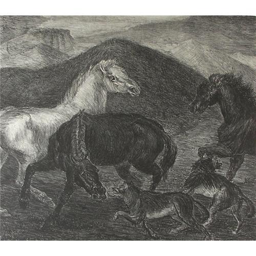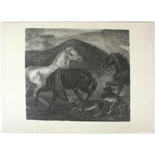 Lawrence Barrett (1897-1973) Broadmoor Art Academy, Lithograph, Horses & Wolves, #10/40, image size 10 7/8" x 12 1/4", unsigned
