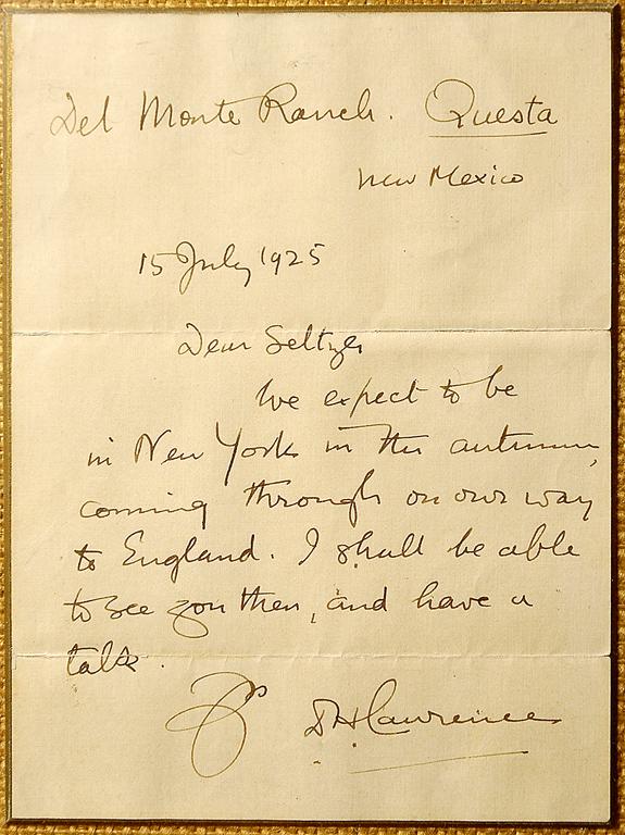 Lawrence, D. H. - ALS From New Mexico (1885-1930) British novelist; his novels analyzed the ills of modern industrial society and the role of sex in human conduct. Autograph letter signed, 1p, 6¾ x 5", Del Monte Ranch, Questa, New Mexico, July 15 1925. To "Seltzer," saying, "We expect to be in New York in the autumn, coming through on our way to England. I shall be able to see you then, and have a talk." Matted with a small color drawing of Lawrence and framed to an overall size of 13¼ x 17"; some nicks to frame. With a COA from the late autograph dealer Charles Hamilton on the verso. Thomas Seltzer was an influential small publisher in New York who published the first U.S. editions of many of Lawrence's works.