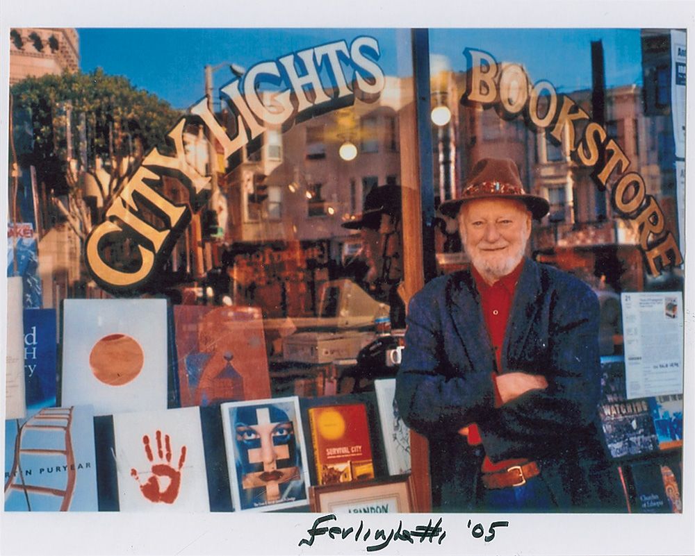 Color glossy 10 x 8 photo of Ferlinghetti at San Francisco’s City Lights Bookstore, signed in the lower border in black felt tip, “Ferlinghetti ‘05.” In fine condition, with some graininess to image.