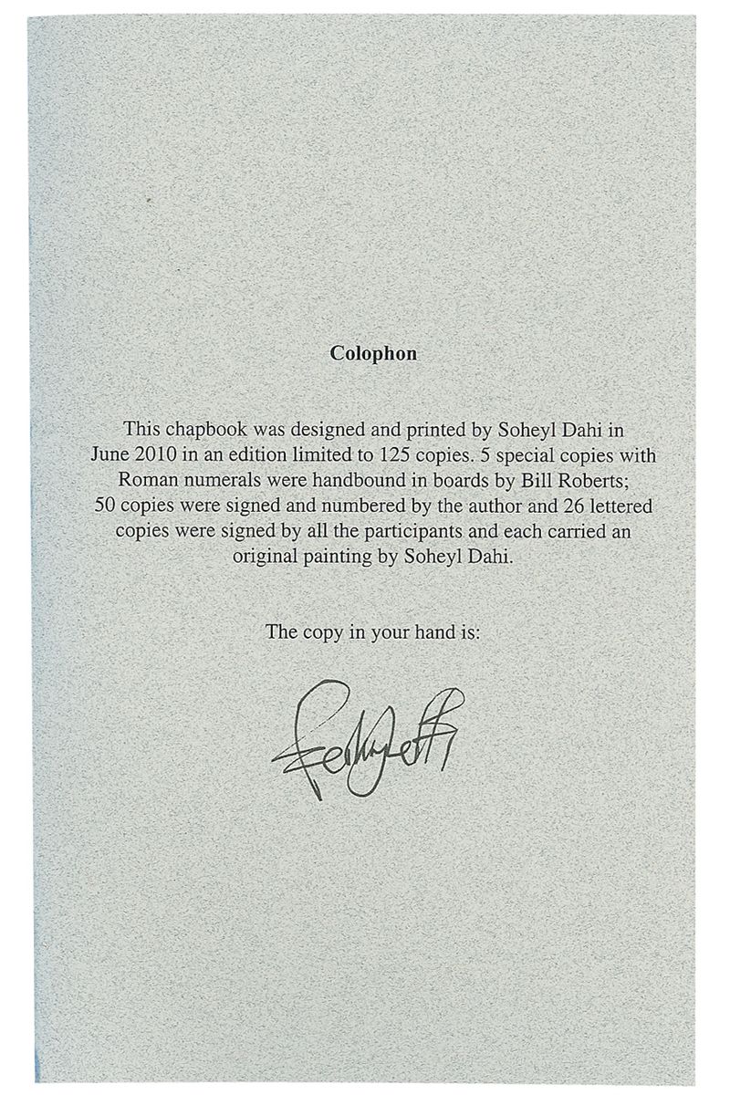 Limited edition chapbook, Bebop Buddhist Ecstasy: Saroyan’s Influence on Kerouac and the Beats, 5.25 x 8, signed on the colophon page, “Ferlinghetti.” In fine condition, with a couple creases to the cover.