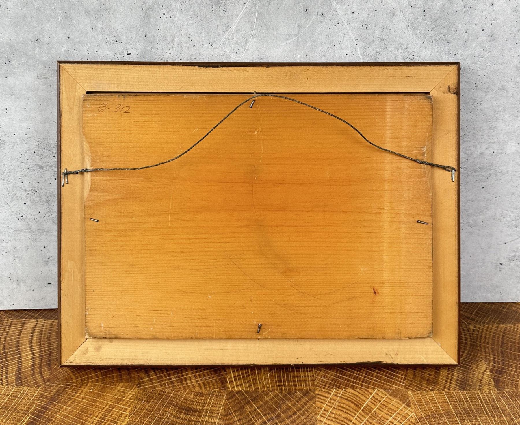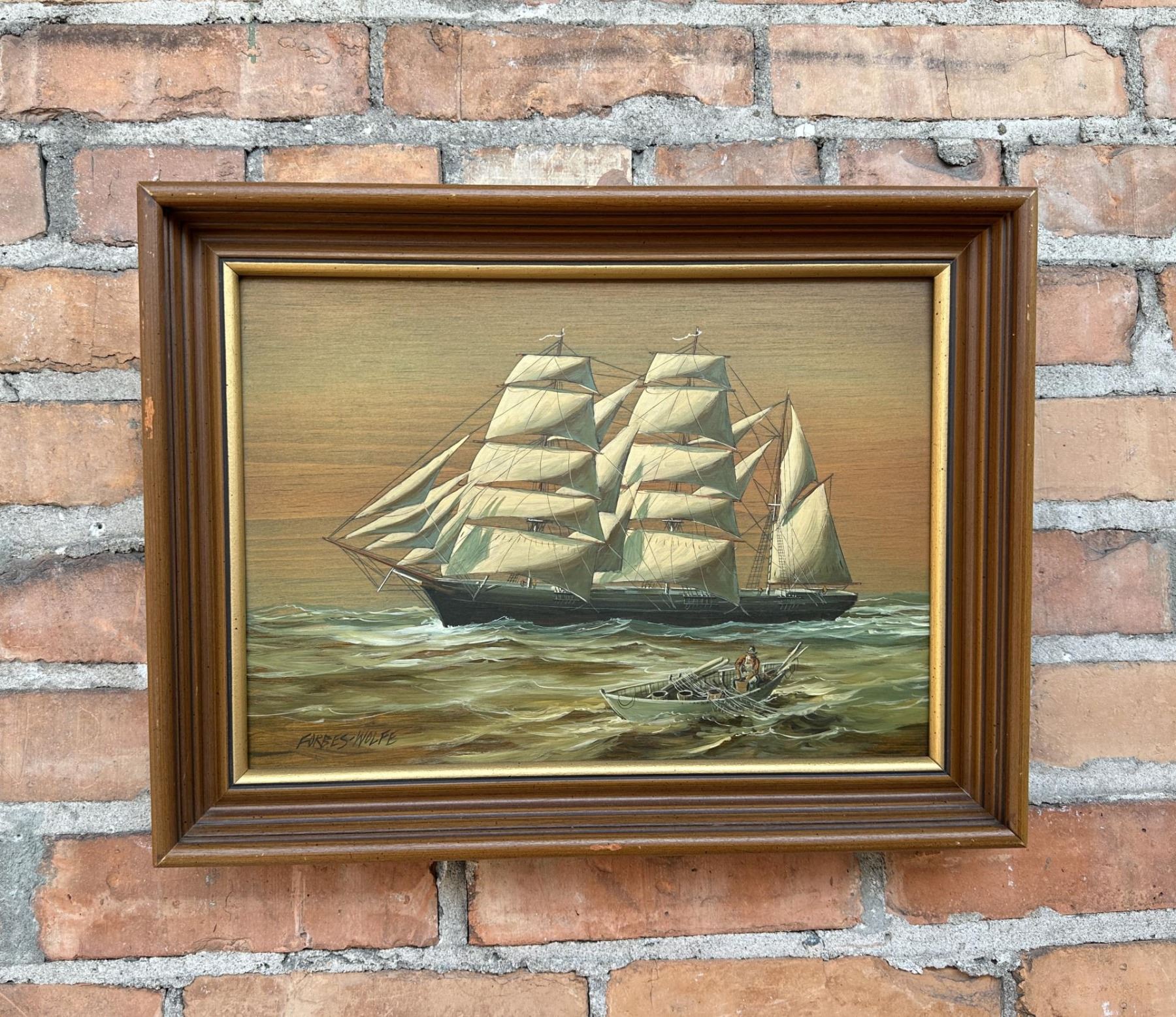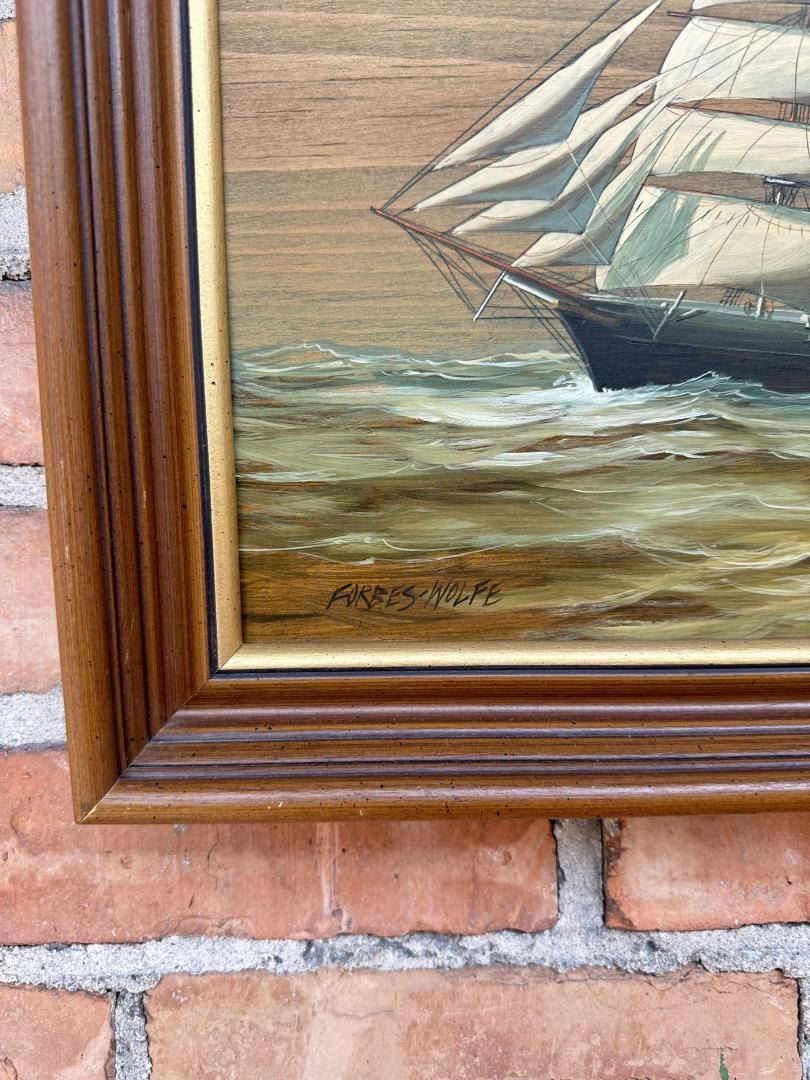 16 3/4" by 12 3/4" framed. Lawrence Forbes-Wolfe is an artist and craftsman based in Piermont, NH. He grew up in rural Iowa near the mighty Mississippi River and was fascinated with arts and crafts at an early age. Despite the fact that most of his time was taken up by farm chores, he eventually saved up enough money to order the Famous Artists course he had seen advertised in magazines and began to fulfill his dream of becoming an artist. Lawrence attended college in South Carolina and Texas and formalized his art studies at the Art Center School of Design in Los Angeles, California, focusing there on advertising design and illustration. In Los Angeles, he worked as an assistant animator in an animation studio, and worked on Cinerama Films, including the space film for the 1961-62 Seattle World’s Fair. As a freelance artist, he did layout and set design for a Disney production of a children’s television show and also designed and constructed audio-visual models for a California public school. In 1966 while traveling in Europe, Lawrence lived and sketched in monasteries at Mt. Athos, Greece. For the next two years, he traveled and worked throughout Europe and Africa, including at the Albert Schweitzer Hospital in Gabon, West Africa. From there, he traveled to Fez, Morocco, where he lived for a number of months and developed his monoprint technique. His new work was exhibited there in a number of American consulates. From 1969 to 1972, Lawrence lived in London, England, where he continued to enjoy creating his monoprints and also found a new interest in marine art and restoration of old sailing ship paintings. During this time he had numerous exhibitions in London of his new work. He returned to New York City in 1972 to concentrate on the monoprints and marine paintings. Between 1972 and 1985 he exhibited his ship paintings in galleries and shows up and down the East Coast. His works may be found in many private collections throughout the United States and Europe. His interest in monoprints continued as he experimented and developed his own oil monotype process. In 1986 Lawrence moved to New England and now lives in Piermont, NH, with his wife Diana. He continues to paint the old sailing ships, and he is focusing more now on creating and exhibiting his monoprints and other creative pieces.