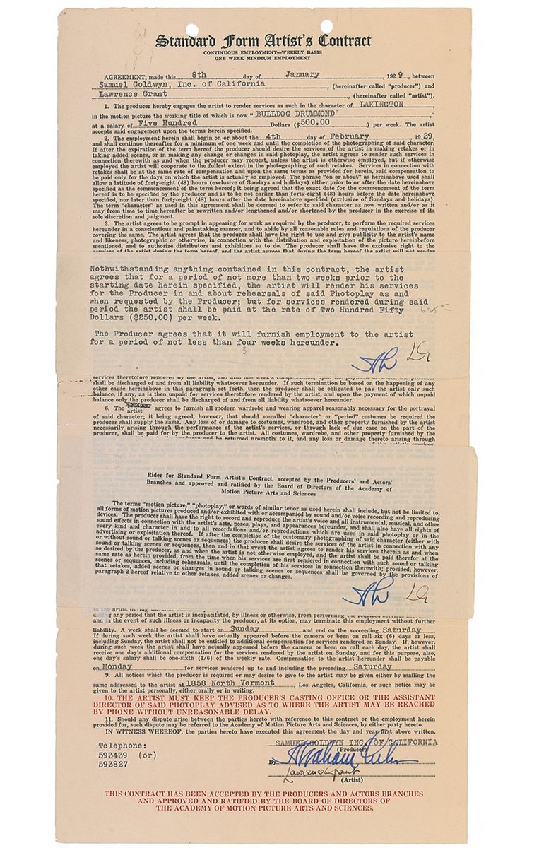 Actor (1870–1952) known for his supporting roles in The Mask of Fu Manchu, Werewolf of London, and Son of Frankenstein. DS, one page, 8.5 x 17, January 8, 1929. A Standard Form Artist’s Contract with Goldwyn Studios, in which Grant agrees “to render service as such in the character of Lakington, in the motion picture the working title of which is now ‘Bulldog Drummond,’ at a salary of Five Hundred Dollars ($500.00) per week.” Affixed to the front are two riders, both initialed by Grant. In very good condition, with multiple paperclip impressions, a couple small tears to the left edge, a uniform shade of toning, and two punch holes to the top. Bulldog Drummond would go on to be nominated for two Academy Awards.