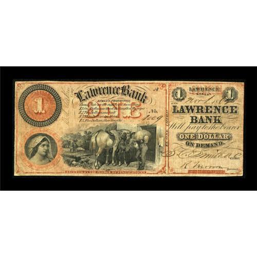 <B>Lawrence, KS- Lawrence Bank</B></I> $1 Nov. 1, 1862 G2a Whitfield 213<BR> A wonderful late issue ABNCo product which utilizes the red tinted Lyman protector. This is an exceptionally rare note from a genuinely rare bank, with this example serving as the plate note in the Haxby reference. <B>Fine-Very Fine.</B></I> <BR><BR><b>Shipping:</b> Coins & Currency (<a target="_blank" href="http://www.heritageauctions.com/common/shipping.php">view shipping information</a>)