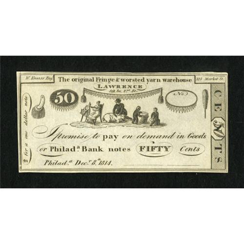 <B>Lawrence, PA- Original Fringe & Worsted Warehouse </B></I>50c Dec. 8, 1814<BR> A nice example of this popular issue that features a vignette of a sheep sheerer in the center. <B>Choice Crisp Uncirculated.</B></I><BR><I>From The Collection of a Louisiana Gentleman</B></I><BR><BR><b>Shipping:</b> Coins & Currency (<a target="_blank" href="http://www.heritageauctions.com/common/shipping.php">view shipping information</a>)