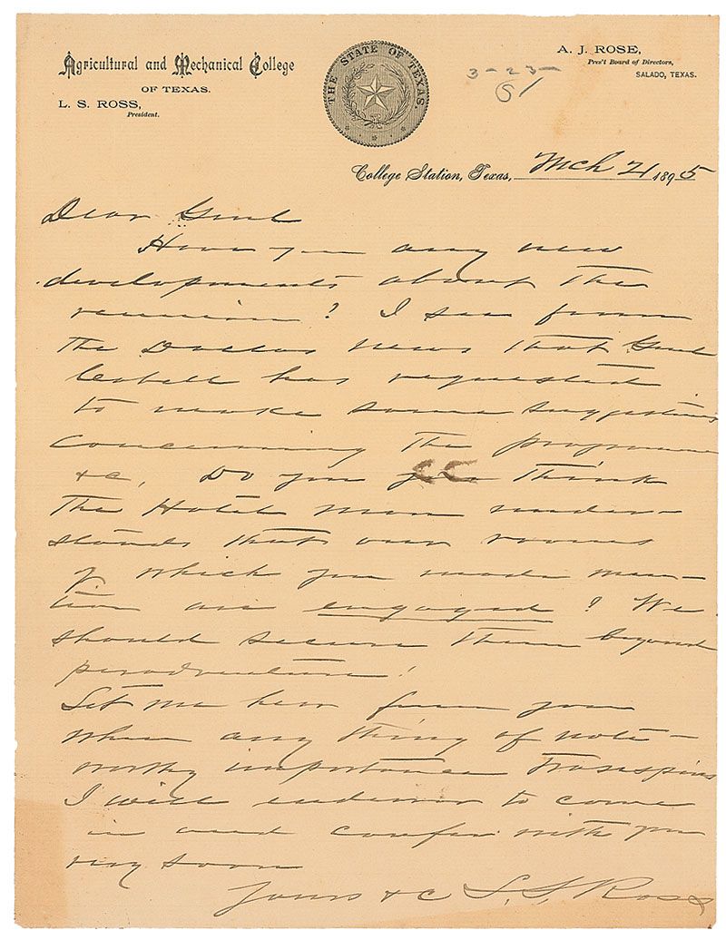 Confederate general and later governor of Texas from 1887–1891. ALS signed “L. S. Ross,” one page, 8.25 x 11, Agricultural and Mechanical College of Texas letterhead, March 21, 1895. Letter to an unidentified general. In part: “Have you any new developments about the reunion? I saw from the Dallas News that Genl Cabell has requested to make some suggestions concerning the program etc. Do you think the Hotel man understands that our rooms of which you made mention are engaged? We should secure them.” Uniform toning and a small tear to top edge, otherwise fine condition. The general referred to in the letter, William Lewis Cabell, was a brigadier general in the Confederate States Army who oversaw several large veteran reunions.