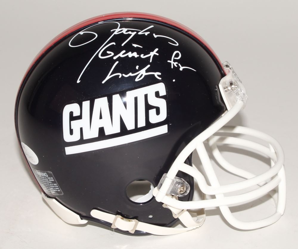 New York Giants mini-helmet. Hand-signed and inscribed in white paint pen by Lawrence Taylor (HOF).
