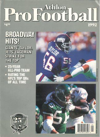 This is an Athlon Sports 1992 Pro Football Magazine with New York Giants Hall of Fame Defensive End Lawrence Taylor on the cover. This Preview has team analysis, predictions, lineups, rosters and more for the 1992 Season