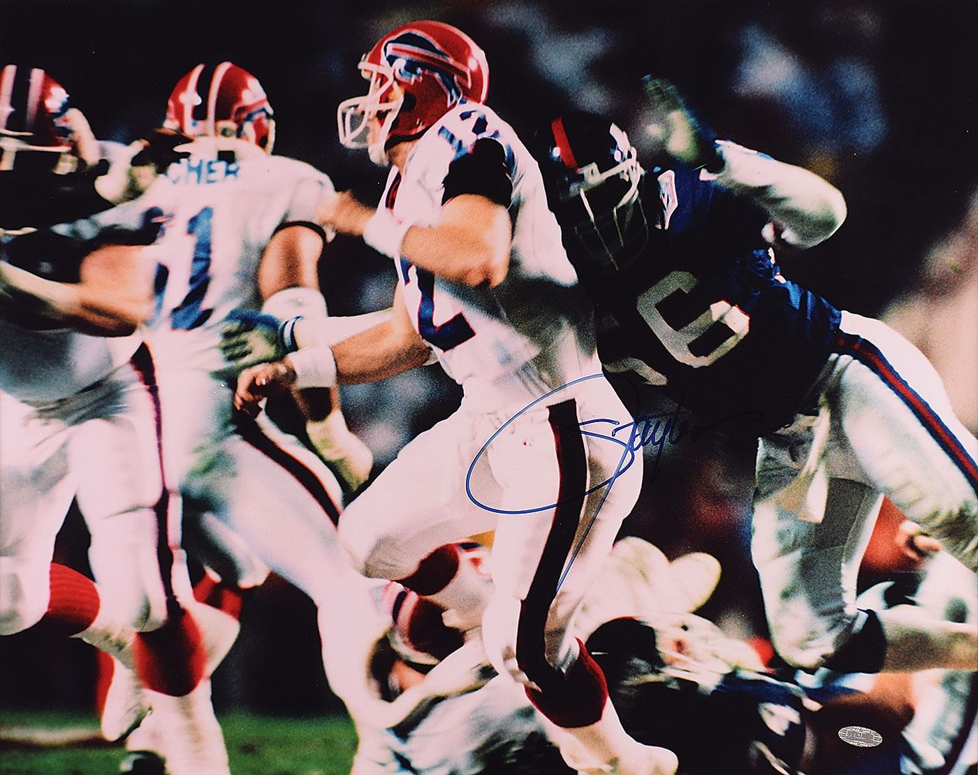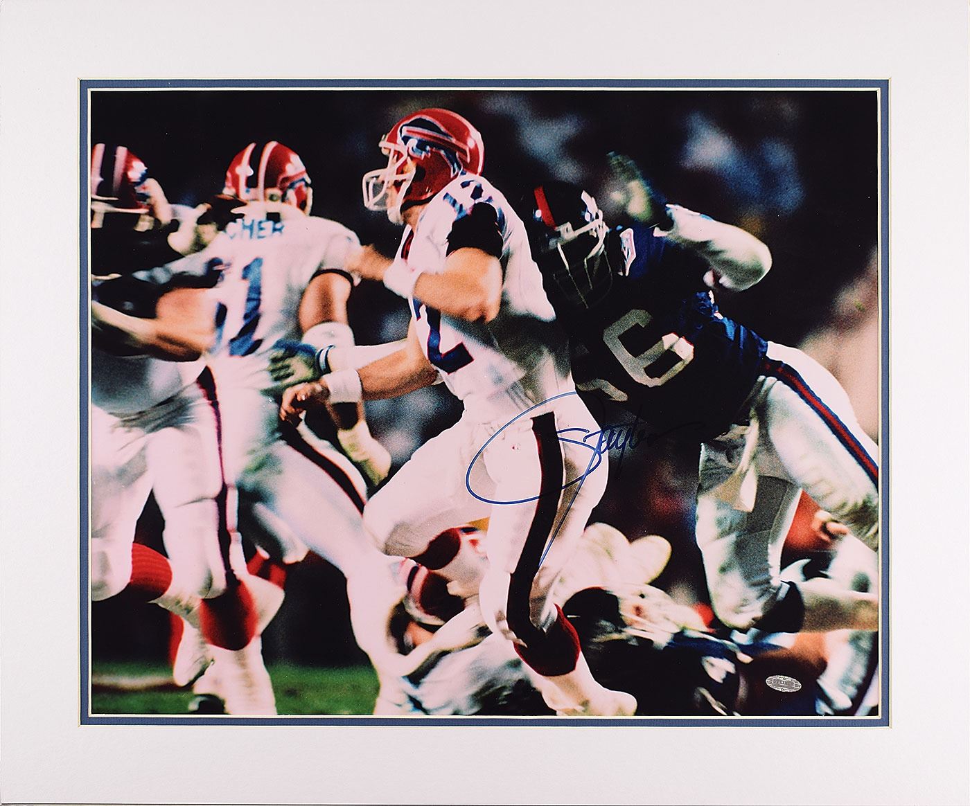 Color glossy 19.5 x 15.5 photo of Lawrence Taylor hitting Jim Kelly in the Super Bowl, signed in blue felt tip by the fearsome linebacker. Double-matted to an overall size of 24 x 20. In fine condition, with a Steiner hologram affixed to the lower right corner. Accompanied by a certificate of authenticity from Steiner Sports.