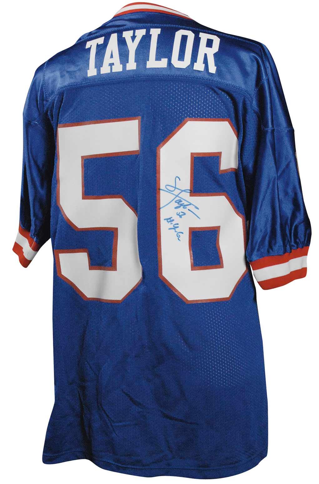 Official Russell New York Giants football jersey signed in blue felt tip on the number on the back, “Lawrence Taylor 56 N.Y.G.” In fine condition, with a slightly fuzzy appearance to signature.