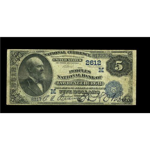 <B>Lawrenceburgh, IN</B></I> - $5 1882 Date Back Fr. 537 <B>The Peoples NB</B></I> Ch. # (M)2612<BR>Lawrenceburgh had five national banks, but no more than two were really in operation at any one time. This note, like so many of the other large size Indiana Nationals offered here tonight, is problem free and boasts gaudy purple signatures.