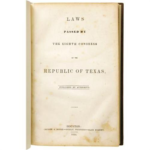 <B><I>Laws passed by the eighth Congress of the Republic of Texas,</B></I></B></I> Houston: Published by Authority. Cruger & Moore, Public Printers, 1844. 120 pp., blank leaf. <I>Abstract of Private Acts and Joint Resolutions</B></I>, [iii]-viii p.; index, vii p. 8.5". <I>The Telegraph and Texas Register</B></I> for April 10, 1844, has this comment: "The printing of the laws was completed on the 27th ult., within five days of the period designated in the contract of the public printers. They were delivered at the State Department on the 1st. inst. The index ... will be printed in a few days and will be in readiness for distribution with the laws this week." Cruger & Moore's bill of April 1, 1844, was for 2000 copies (Mss. Archives, Texas State Library). These laws are given in a page-for-page reprint in Gammel, Vol. II, p. [913]-1046, except that in the Gammel reprint the <I>Index</B></I> precedes the <I>Abstract of Private Acts</B></I> and the imprint on the title page omits the name and address of the printer. Occasional minor foxing; moderate water staining throughout. Full gold-stamped leather. An important abstract relating to early legislation in the Republic of Texas. <I>From the collection of Darrel Brown.</B></I><BR><BR><B>Reference:</B></I> Streeter <I>Texas</B></I> 603. Raines, p. 231. Sabin 95000.<BR><BR><b>Shipping:</b> Books & Catalogs (<a target="_blank" href="http://www.heritageauctions.com/common/shipping.php">view shipping information</a>)