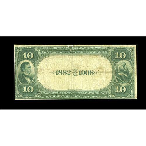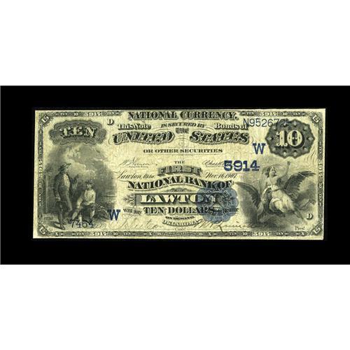 <B>Lawton, OK</B></I> - $10 1882 Date Back Fr. 546 <B>The First NB</B></I> Ch. # (W)5914<BR>This bank issued large notes only prior to entering receivership just a few days before Christmas in 1921. We sold an example of this type and denomination in VG-F at our 2004 Milwaukee Central States Numismatic Society Signature Sale for $747.50. It had a cut in lower margin and was certainly not the visual equal of this <B>Fine</B></I> note. Perhaps the only thing one might quibble about is the tiny skinned area near the top margin on the back, which really fails to detract in the slightest from the overall credentials of this scarce item.<BR><BR><b>Shipping:</b> Coin/Currency (<a target="_blank" href="http://www.heritageauctions.com/common/shipping.php">view shipping information</a>)
