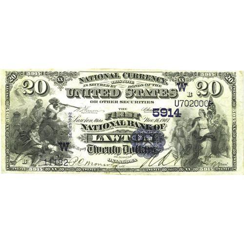 <B>Lawton, OK</B></I> - $20 1882 Value Back Fr. 583 <B>The First NB</B></I> Ch. # (W)5914<BR>A nice example of this very scarce type with excellent color, bold pen signatures, and considerably better centering than is normally encountered on even the most common Value Backs. <B>Very Fine.</B></I>