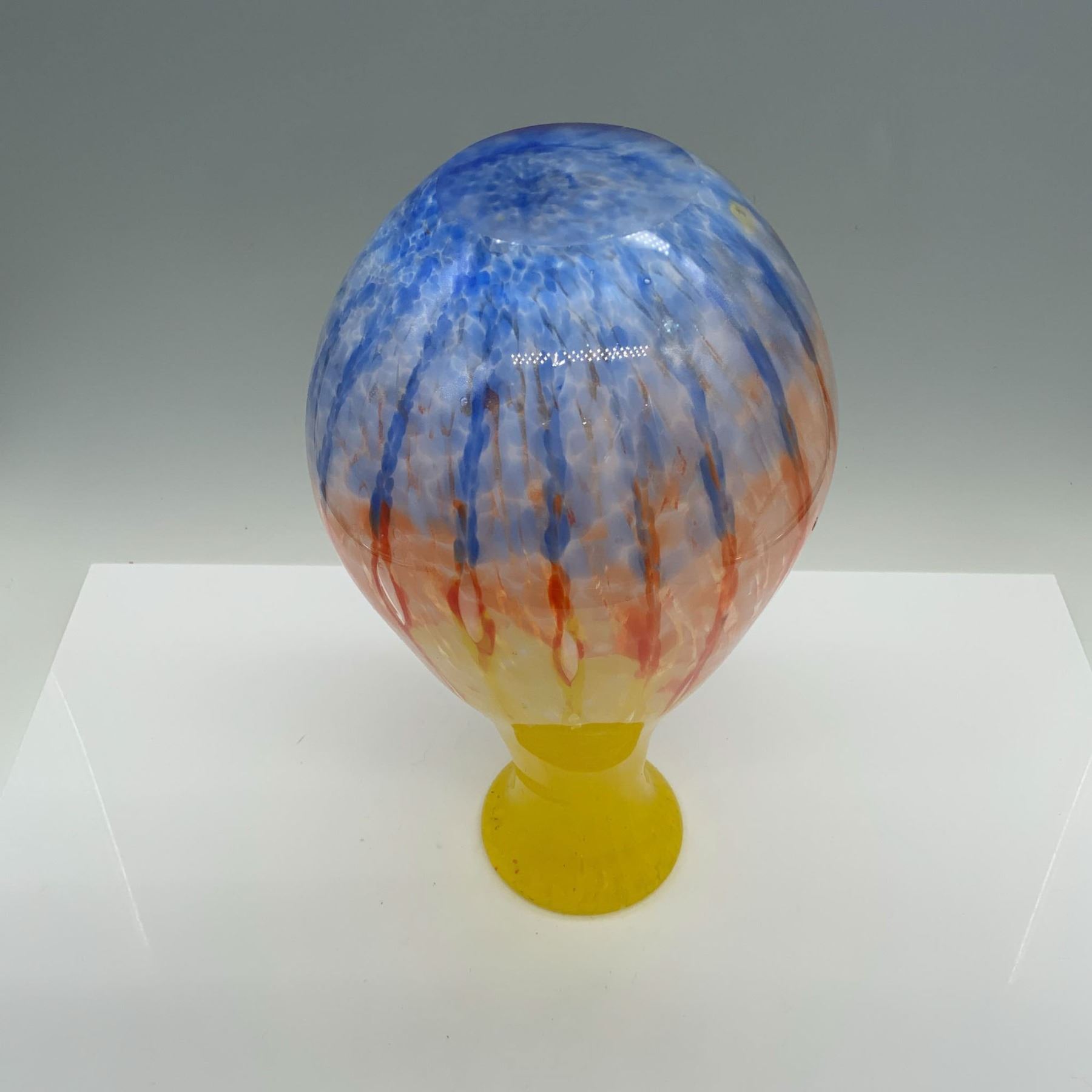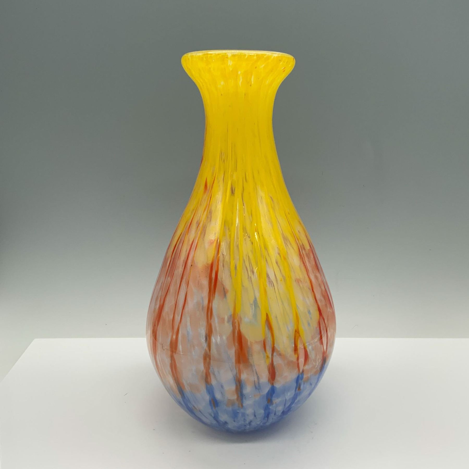 Art glass vase showcasing bold red vertical lines paired with dynamic blotch patterns. The striking design combines strong, linear elements with abstract, organic shapes, creating a captivating visual contrast.