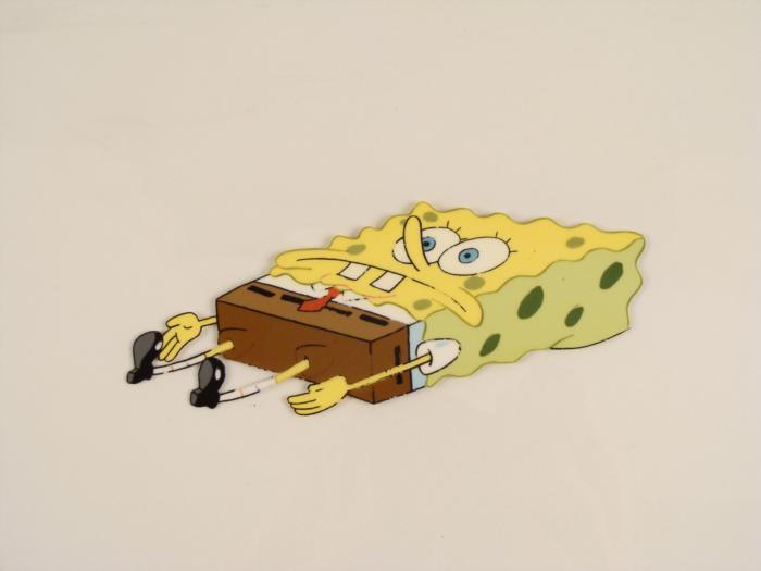 This original animation cel is from the Nickelodeon TV show SpongeBob Squarepants. The story takes place under the deep blue sea in Bikini Bottom, where SpongeBob resides. SpongeBob, who is a yellow, porous sponge, is your typical happy-go-lucky character, as he is always cheerful and enjoys making people laugh. Patrick Star, SpongeBob's neighbor who is a starfish, is your average children's show idiot, as he boasts knowing nothing and is often getting himself into ridiculous situations. Between the homes of these two lies the home of the miserable Squidward, a squid, who is known for being grouchy and playing tricks on SpongeBob and Patrick. Both SpongeBob and Squidward work at the Krusty Krab, a fast food business run by the greedy money-loving Mr. Krabs, a crab, the arch rival of the evil, possibly misunderstood, Plankton. Another neighbor, Sandy Cheeks, an athletic squirrel who normally wears an astronaut's space suit, was introduced in "Tea at the Treedome." She spends most of her time inventing and experimenting. SpongeBob is laying on the ground.Original Production Animated Cel and Drawing Original "rough" animation drawing, in black and non-photo blue pencil and brown, with notations in black. Overall Size of Drawing: 10 1/2" x 12 1/2" Overall Size of Cel: 10 1/2" x 12 1/2" Excellent ConditionThis is an original hand-painted cel set-up used in the production of an episode of "SpongeBob SquarePants." Each one-of-a-kind set-up represents a slight change in position of the characters. When individually photographed and projected in rapid succession, the images appear to move.