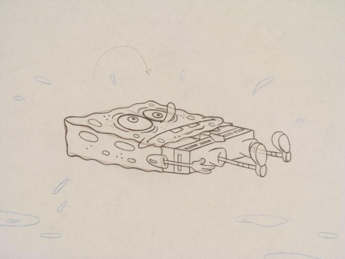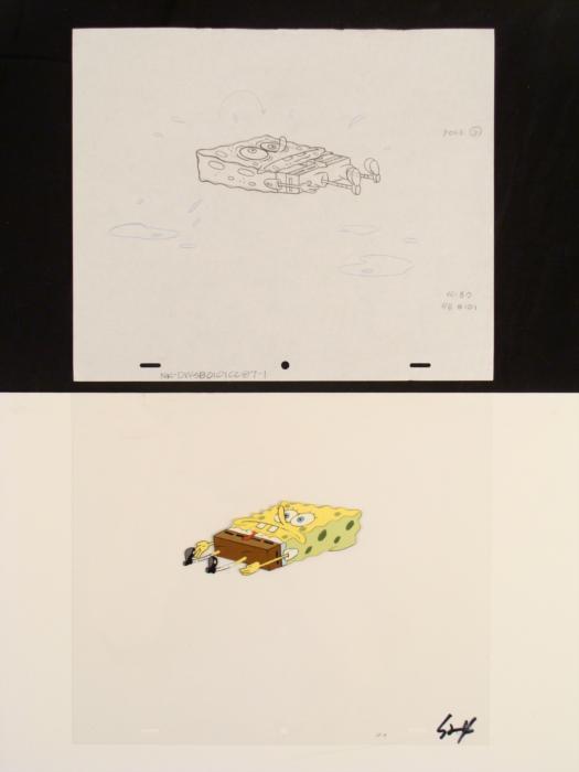 This original animation cel is from the Nickelodeon TV show SpongeBob Squarepants. The story takes place under the deep blue sea in Bikini Bottom, where SpongeBob resides. SpongeBob, who is a yellow, porous sponge, is your typical happy-go-lucky character, as he is always cheerful and enjoys making people laugh. Patrick Star, SpongeBob's neighbor who is a starfish, is your average children's show idiot, as he boasts knowing nothing and is often getting himself into ridiculous situations. Between the homes of these two lies the home of the miserable Squidward, a squid, who is known for being grouchy and playing tricks on SpongeBob and Patrick. Both SpongeBob and Squidward work at the Krusty Krab, a fast food business run by the greedy money-loving Mr. Krabs, a crab, the arch rival of the evil, possibly misunderstood, Plankton. Another neighbor, Sandy Cheeks, an athletic squirrel who normally wears an astronaut's space suit, was introduced in "Tea at the Treedome." She spends most of her time inventing and experimenting. SpongeBob is laying on the ground.Original Production Animated Cel and Drawing Original "rough" animation drawing, in black and non-photo blue pencil and brown, with notations in black. Overall Size of Drawing: 10 1/2" x 12 1/2" Overall Size of Cel: 10 1/2" x 12 1/2" Excellent ConditionThis is an original hand-painted cel set-up used in the production of an episode of "SpongeBob SquarePants." Each one-of-a-kind set-up represents a slight change in position of the characters. When individually photographed and projected in rapid succession, the images appear to move.