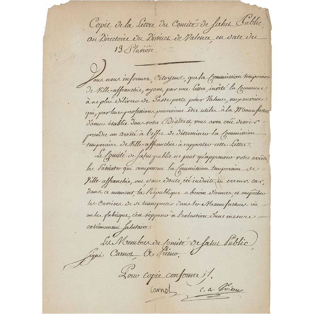 LS in French, signed “Carnot,” one page, 8.25 x 11.25, February 1, 1794. Letter concerning the need for a large amount of weapons, issued during the 'reign of terror,' in part (translated): "Letter from the Committee of Public Safety to the Directory of the District of city of Valence, dated 13 Pluviose…You inform us, Citizens, that the Commission of Ville-affranchie [the city of Lyon was renamed 'freed city' after the massacres of 1793 opposing different groups of revolutionaries] having invited the city of Valence to no longer issue passports to workers who, by their profession could be useful to weapons factories…The Committee of Public Safety can only approve your decree, the Patriots who form the Commission of Ville-affranchie have undoubtedly been misled; because, at this moment, the Republic needs weapons; and to prevent the workers from transporting themselves to the factories where they are manufactured, is to oppose the execution of an extremely salutary measure.” Signed at the conclusion by Lazare Carnot, and countersigned by Claude Antoine, comte Prieur-Duvernois. In very good to fine condition, with some light creasing, and a short split to the bottom of the vertical fold, just impinging on Carnot's signature.