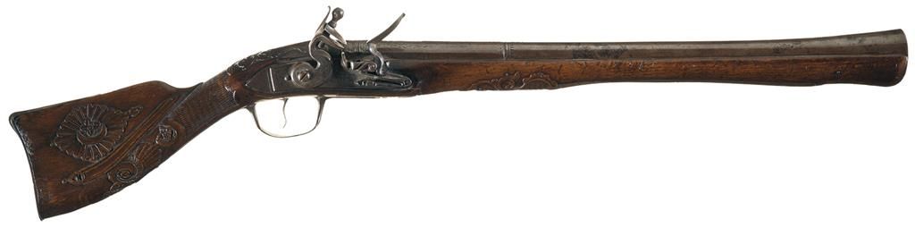 Produced with a groove rear sight and no front sight, with "L*LAZARINO" on the top and left side of the breech, along with a pair of English-style crossed scepter stamps on the upper left, scroll engraving and a flared muzzle. The lock plate and hammer are also scroll engraved. Checkered straight wrist stock, with raised scroll and floral patterns and an engraved buttplate on the short buttstock.