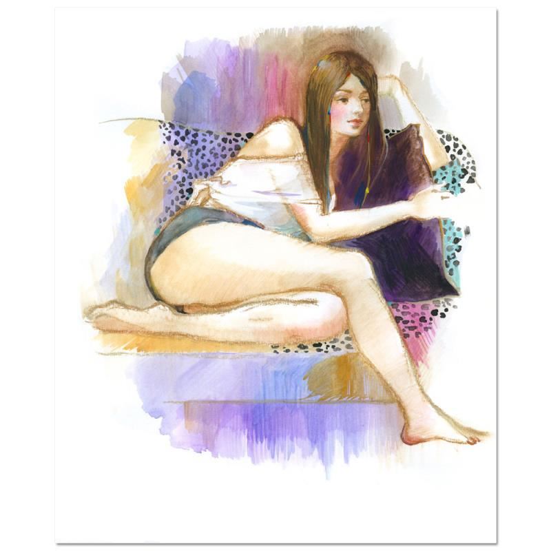 "Lazy-Afternoon" is an original painting, mixed media (ink and gouache) on vellum art paper, by Lena Sotskova. This piece is hand signed by the artist, hand titled, and accompanied by a certificate of authenticity. Measures approximately 17" x 14".