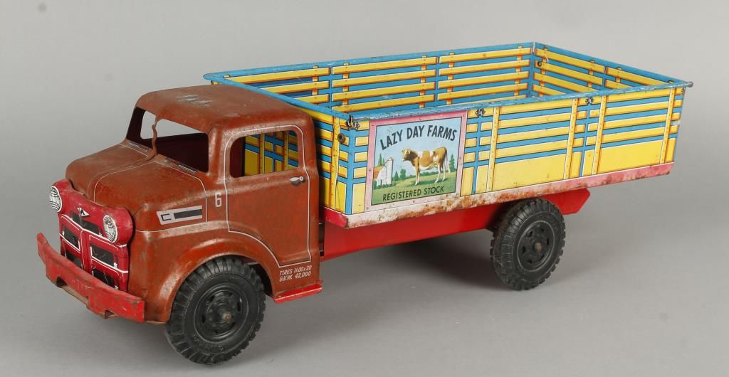 With Registered Stock Cow Logo on side, made by the Mars Toy Company, it is not rolling. Finish is good and minor rust on bed.