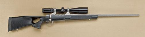 Lazzeroni Model 2000, highest quality bolt-action long-range rifle, in 7.82 Warbird caliber. Fluted barrel, polymer thumb-hole stock, rear of receiver marked “World Class”, serial #L2345050. Breech factory marked “R.E. Petersen”, barrel roll-die stamped “Global Hunter”. The gun is mounted with a Schmidt and Bender highest German quality scope, 4x16 power by 50 on factory rail mounts. This maker is considered one of the finestlong-range arms makers in America and was well equipped for Robert Petersen who appreciated and promoted his accurate arms. If you miss with this rifle, it’s your fault. From the Robert Petersen collection. Est:$2,500 - $5,000