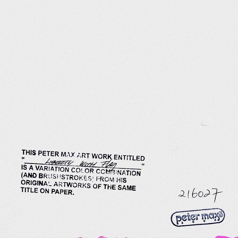 "Lberty with Flag" is a one-of-a-kind mixed media on paper, hand signed by Peter Max. The piece comes custom framed with a backside cutout to display Peter Max Studio registration number 216027 certifying authenticity. Measures approximately 28" x 24" (frame), 19" x 15" (image). This item requires special handling and may have a longer than usual turnaround.