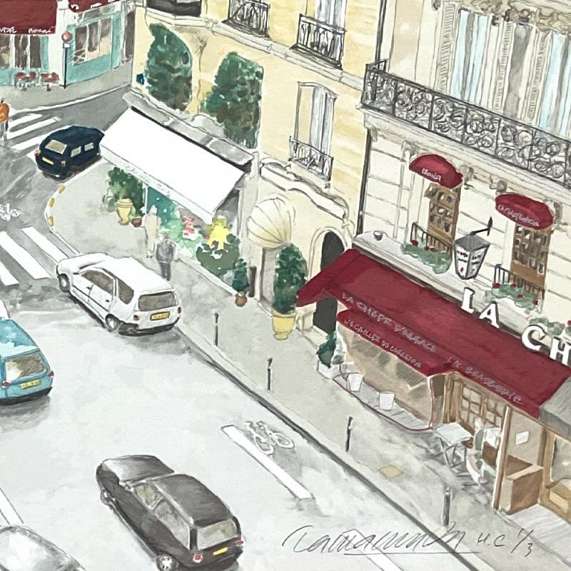 "Le Carrefour De L'odeon" is a limited edition serigraph on paper by Toyoo Tamamura, HC numbered 1/3 and hand signed by the artist. Includes Letter of Authenticity. Measures approx. 18.5" x 15" (border), 13.5" x 21" (image).