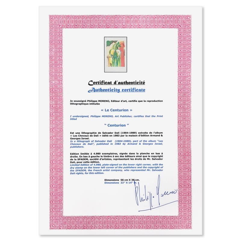 "Le Centurion" is a limited edition lithograph by Salvador Dali (1904-1989), bearing the plate signature of the artist. This piece was published by Armand & Georges Israel in 1983 during Dali's lifetime and under his supervision. This piece was printed on Velin D'arches paper in Paris. This work is referenced in The Official Catalog of the Graphic Works of Salvador Dali (Albert Fields). This piece comes custom framed. Includes Certificate of Authenticity. Measures approx. 20" x 28" (frame), 14" x 22" (image).