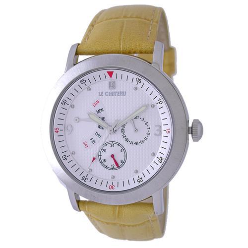 This Elegant Le Chateau Watch From The "Romana Collection" Features An All Stainless Steel Case, A Multifunction Movement With Day/Date And Military Time, Genuine Leather Band, And A Gorgeous "Textured". Watch Is Water Resistant And Includes Three Year Manufacturer's Warranty.