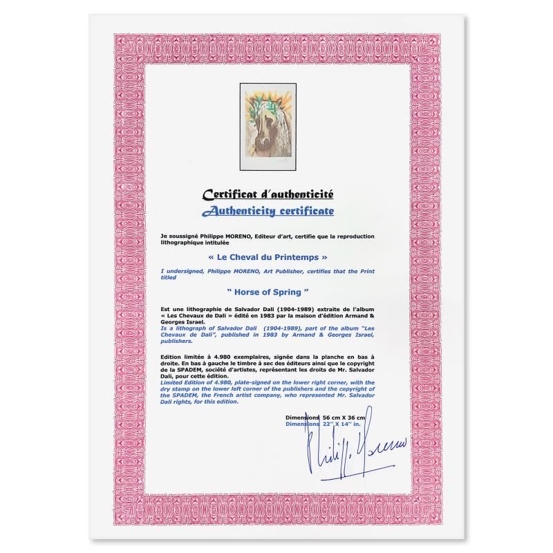 "Le Cheval du Printemps (Horse of Spring)" is a limited edition lithograph by Salvador Dali (1904-1989), bearing the plate signature of the artist. This piece was published by Armand & Georges Israel in 1983 during Dali's lifetime and under his supervision. This piece was printed on Velin D'arches paper in Paris. This work is referenced in The Official Catalog of the Graphic Works of Salvador Dali (Albert Fields). This piece comes custom framed. Includes Certificate of Authenticity. Measures approx. 20" x 28" (frame), 14" x 22" (image).