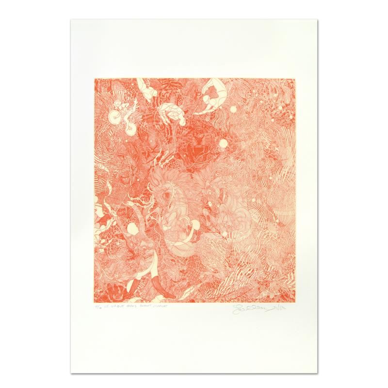 "Le Cirque (Burnt Scarlet)" is a limited edition etching on paper by Guillaume Azoulay! This piece is numbered and hand signed by the artist. Includes Certificate of Authenticity! Measures approx. 22" x 30" (border), 18" x 20" (image).