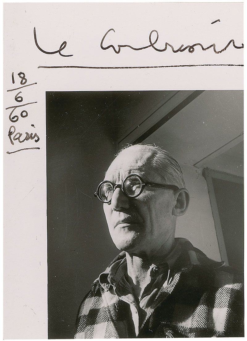 Important architect, artist, and industrial designer (1887–1965) whose central role in the development of the International Style made him one of the most influential and widely debated figures in the history of architecture. Vintage glossy 3.25 x 4.5 head-and-shoulders photo, signed in the border in black ink, “Le Corbusier 18/6/60 Paris.” Photo is affixed by its left edge to a 5 x 8.25 white card. In fine condition.