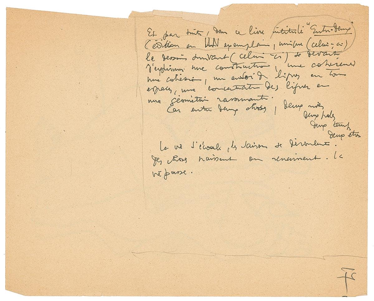 Important French architect, artist, and industrial designer (1887–1965) whose central role in the development of the International Style made him one of the most influential and widely debated figures in the history of architecture. Abstract blue crayon sketch of two nude female figures on a 9 x 11.5 off-white sheet, signed “L-C,” with Le Corbusier adding an unsigned handwritten paragraph on the reverse, referencing a book called “Between.” Paragraph on reversre reads (translated): “And therefore should be in this book titled "entre deux" (between two) edition in one exemplaire, only one time the following drawing (that one) should remain a construction, a coherence a cohesion, a firework between lines in all directions a concentration of lines in a expressed soothing geometrie Because between two things, two shores, two poles, two tides.” In very good condition, with uniform light toning, show-through from manuscript on reverse, and a vertical crease and several edge tears to right edge, lightly affecting the manuscript, but not the sketch.