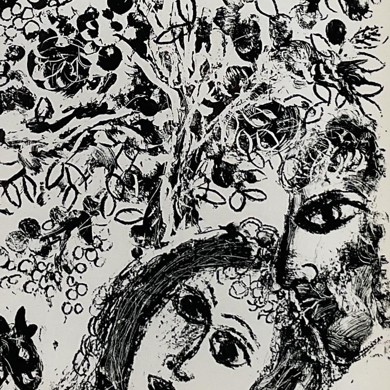 "Le Couple Devant L'arbre" is a lithograph on paper by Marc Chagall (1887-1985). This piece comes custom framed. Includes Letter of Authenticity. Measures approx. 17.5" x 20.5" (frame), 9" x 12" (image).