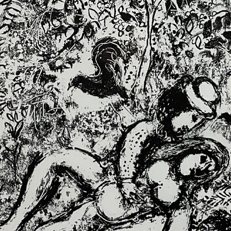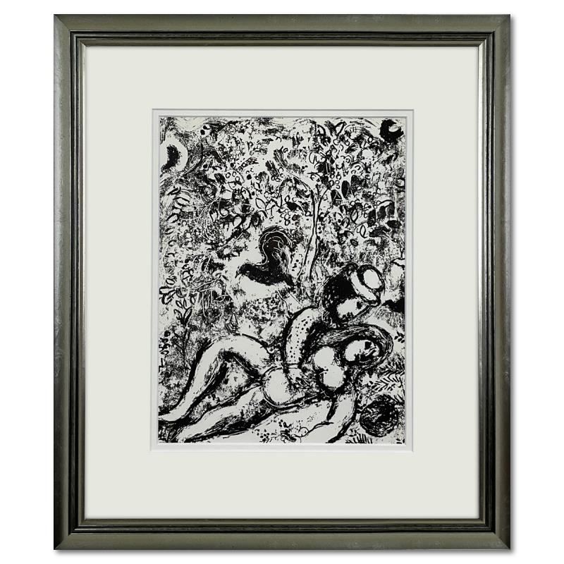 "Le Couple a L'Arbre" is a lithograph on paper by Marc Chagall (1887-1985). This piece comes custom framed. Includes Letter of Authenticity. Measures approx. 17" x 20.5" (frame), 9.5" x 12" (image). There is a small scratch on the top-right part of the protective acrylic cover.