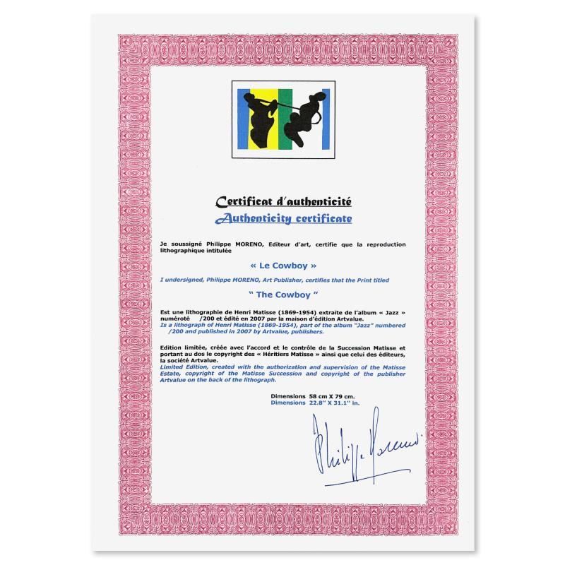 "Le Cowboy (The Cowboy)" is a limited edition lithograph by Henri Matisse (1869-1954). This piece comes from an edition of 200 authorized by the Matisse Estate; the edition number is not on the piece itself but on the certificate. This piece comes custom framed. Includes Certificate of Authenticity. Measures approx. 37" x 29" (frame), 31" x 23" (image).