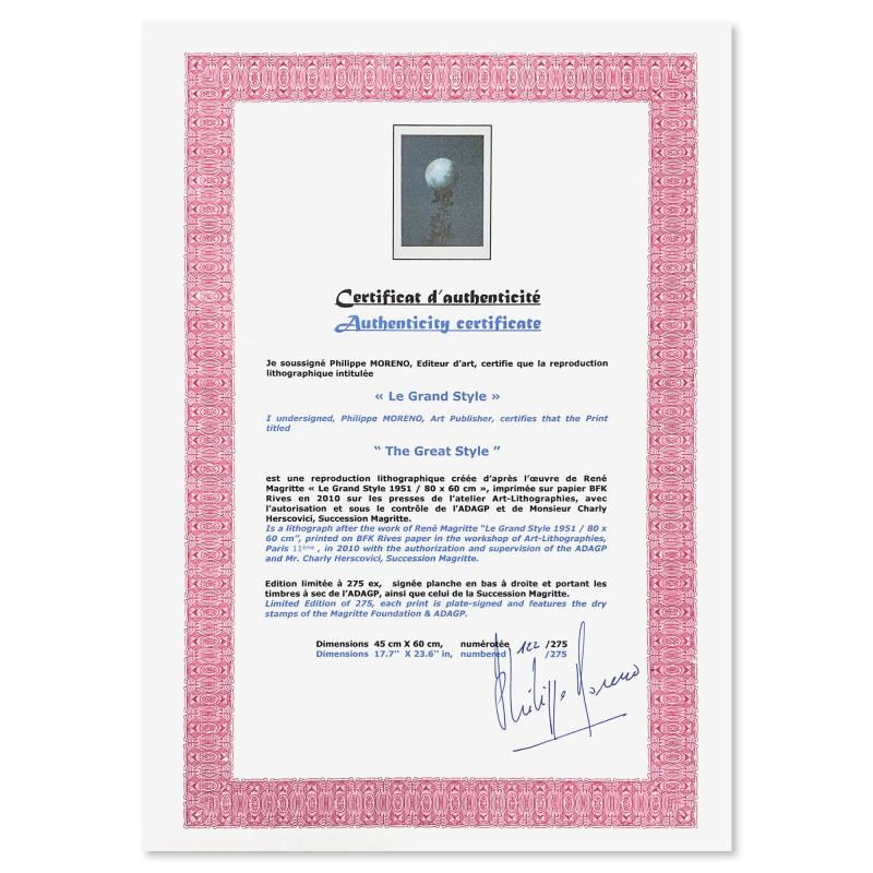 "Le Grand Style (The Great Style)" is a limited edition lithograph by Rene Magritte (1898-1967). This piece is numbered 122/275 and bears the dry stamps of the Magritte Foundation & ADAGP (Society of Authors in the Graphic and Plastic Arts) and is signed by the President of the Magritte Foundation, Charly Herscovici. This piece comes custom framed. Includes Certificate of Authenticity. Measures approx. 24" x 29.5" (frame), 18" x 23.5" (image).