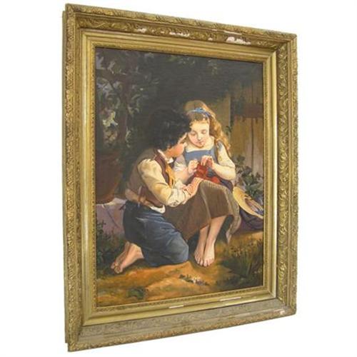 This lovely copy of Le leçon de tricot (known also as Special Moment and Knitting Lesson) after Emile Munier (1840-1895) dates from the late 19th to early 20th century. Signed "E. MUNIER" in lower right corner. Canvas measures 19 1/8" by 25 1/4" and frame measures 24.75" by 30.75" by 3". Giltwood and gesso frame is old and likely from the period of the painting. Canvas is in good condition. Painting craquelure is consistent with age. There are a couple very small (<1/8") craquelure losses near the pocket of the boy's right leg. There are no identifying marks on the rear. This painting was purchased in the 1980s by Roni Steinberg Sokoloff and resided in the home on her former 63 acre estate in Bedford New York, known as Cantitoe Farms. (This estate is down the road from Martha Stewart's estate of the same name.) The painting is being sold exclusively here on behalf of Ms. Sokoloff.