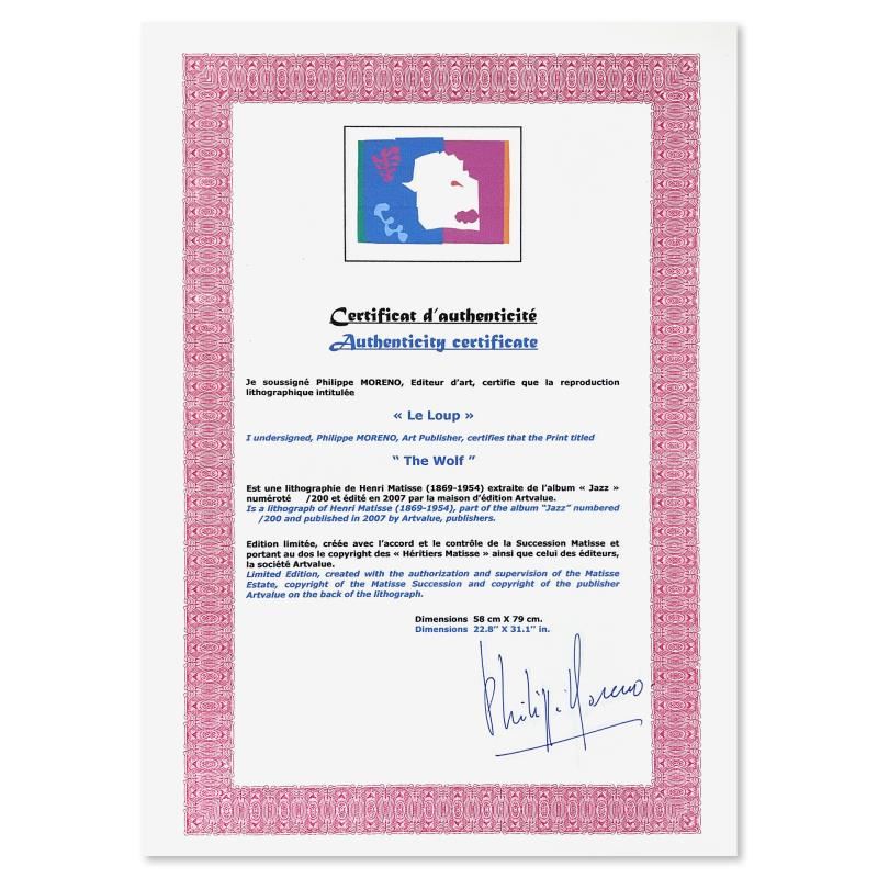 "Le Loup (The Wolf)" is a limited edition lithograph by Henri Matisse (1869-1954). This piece comes from an edition of 200 authorized by the Matisse Estate; the edition number is not on the piece itself but on the certificate. This piece comes custom framed. Includes Certificate of Authenticity. Measures approx. 37" x 29" (frame), 31" x 23" (image).