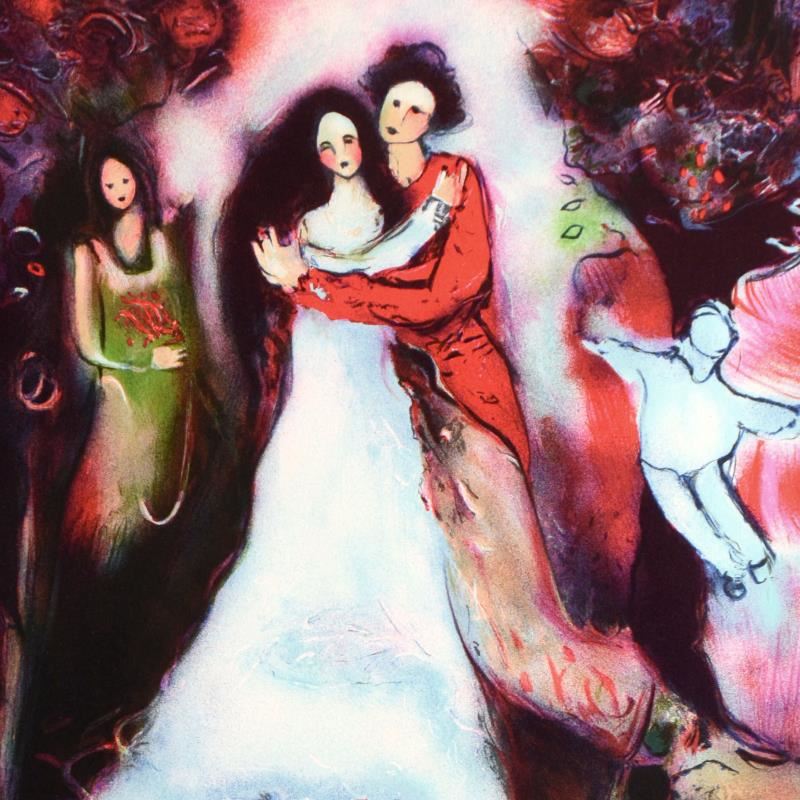 "Le Mariage" is a limited edition lithograph on paper by Raya Sorkine, numbered and hand signed by the artist. Measures approx. 21.5" x 29.5" (border). 17.5" x 24" (image).