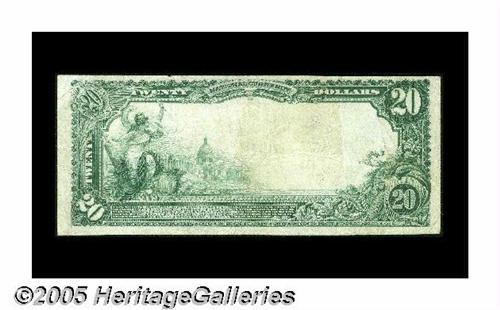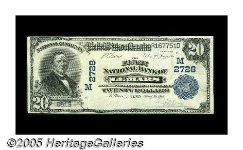 <B>Le Mars, IA</B></I> - $20 1902 Plain Back Fr. 650 <B>The First NB</B></I> Ch. #(M)2728<BR>This <B>Very Fine</B></I> example hails from the only issuing bank in town to survive long enough to order the Third Charter designs. It failed in 1934, leaving the community without benefit of a federally chartered institution.