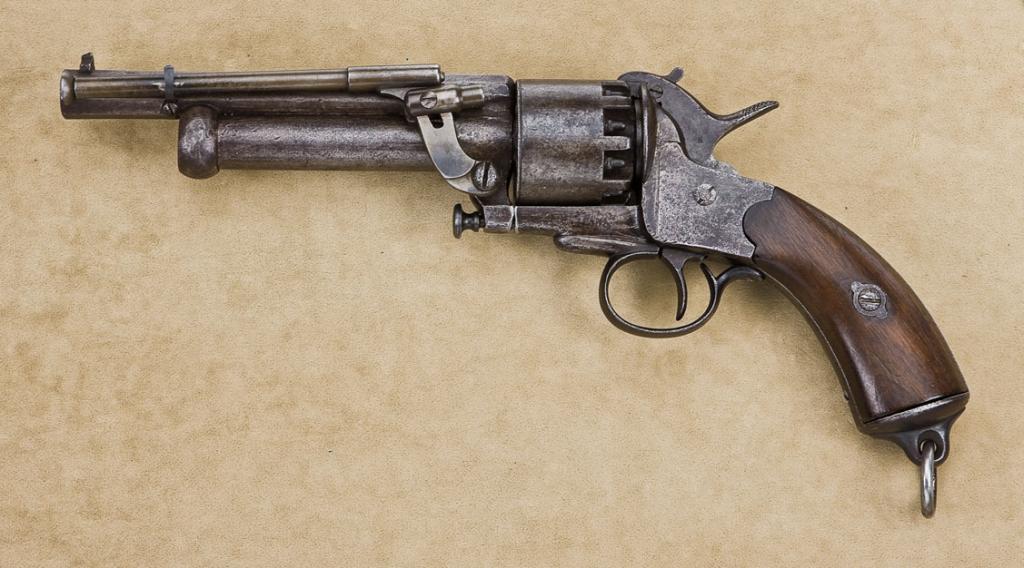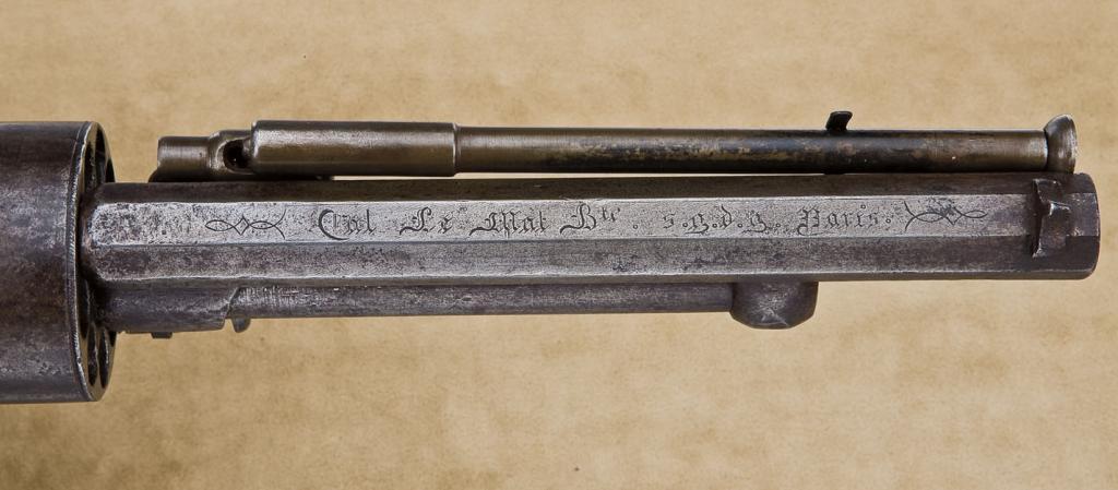 Le Mat Second Model Two-Barrel percussion revolver, .42 cal., 9-shot round cylinder and .63 cal. under barrel single shot for firing buckshot, pivoting hammer spur to actuate the cylinder chambers or the under barrel, blue finish, wood grips, #1748 (desirable serial # range) marked on frame, cylinder and barrel assembly (barrel assembly also shows LM under a five pointed star after the serial number). This gun is in overall good condition showing an even grey patina over metal surfaces that display scattered erosion and pitting areas with some knackering on the bottom of the frame, barrel address is hand cut “Col Le Mat Bte s.g.d.g. Paris”; good action and markings, dark bores, restoration of loading lever, barrel assembly screw and small outer frame spring; slightly sanded grips with several slight nicks and mars from carry and storage; lanyard ring retained. A very presentable Le Mat. From the Richard Wolfe Collection. Est.: $4,000-$8,000.