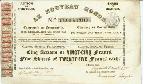 1850, France. Stock certificate. For working Gold Mines In California. Black. Uncancelled. Very fine.