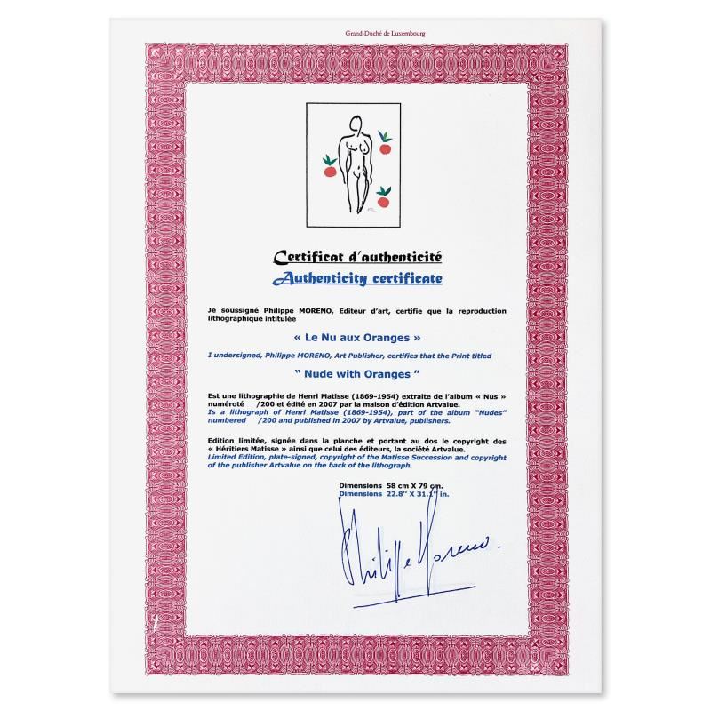 "Le Nu aux oranges" is a limited edition lithograph by Henri Matisse (1869-1954) bearing the plate signature of the artist. This piece comes from an edition of 200 authorized by the Matisse Estate; the edition number is not on the piece itself but on the certificate. This piece comes custom framed. Includes Certificate of Authenticity. Measures approx. 28.5" x 37" (frame), 22.5" x 31" (image). This item requires special handling and may have a longer than usual turnaround.