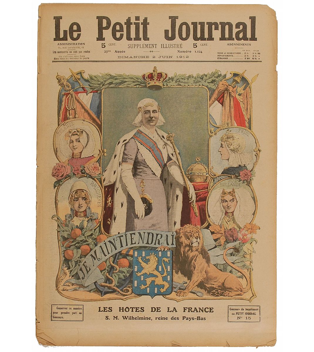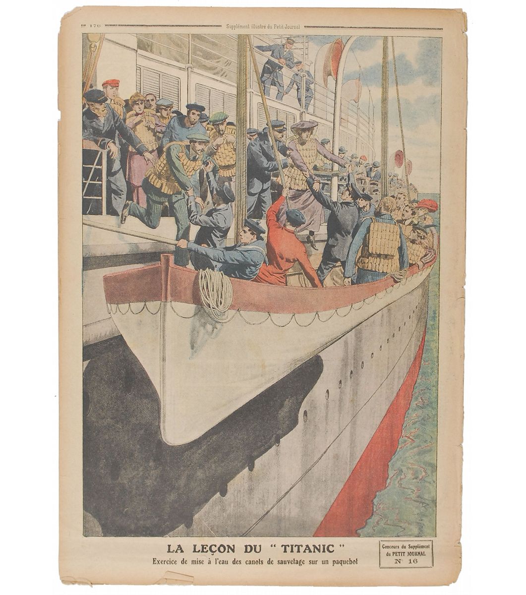 Original color supplement of the Le Petit Journal, 12 x 17, dated June 2, 1912, with the back cover featuring a full page illustration of ship passengers entering into a lifeboat, captioned at the bottom, in French, “La Lecon du Titanic,” [The Lesson of Titanic]. In very good condition, with scattered edge tears and chips, mild toning, and a partial separation to hinge.