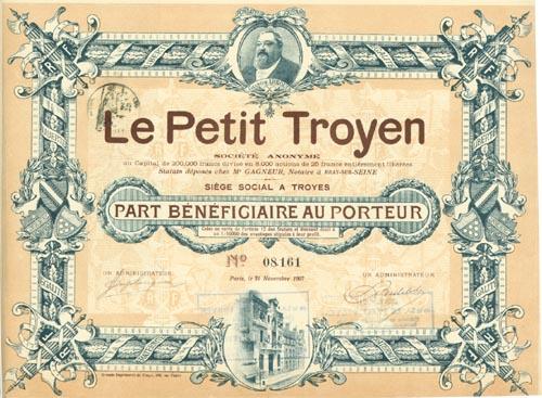 1907, Paris, France. Stock certificate. Brown/Blue on tan background. Ornate border with vignette of man's bust at top center and building at bottom center.