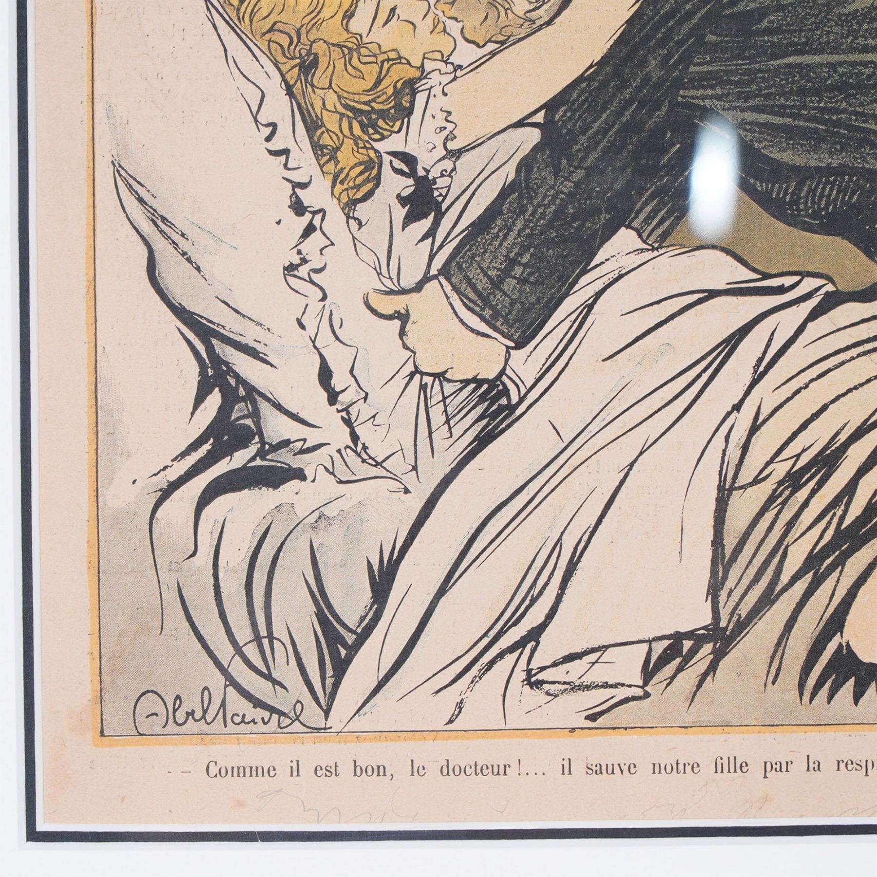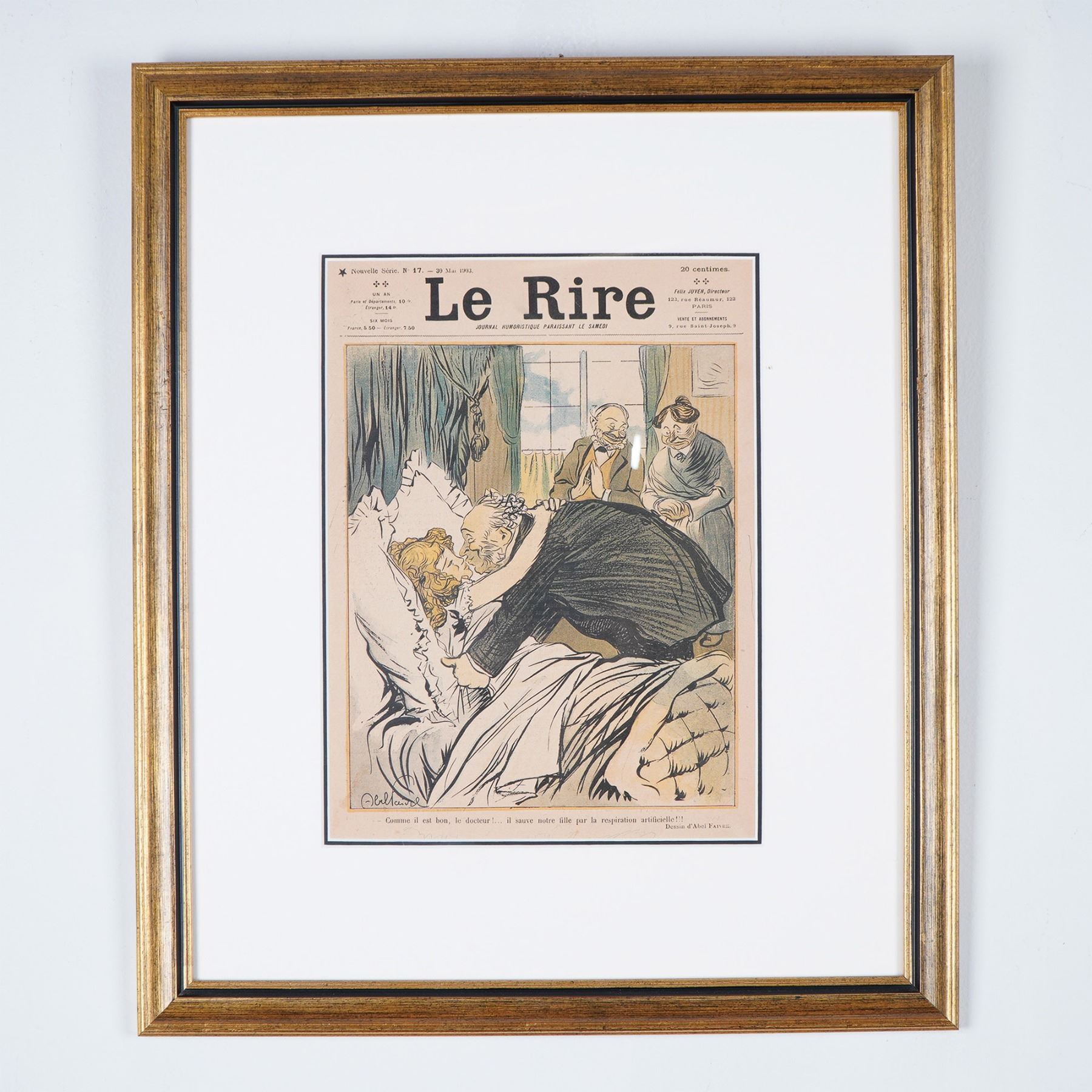 A framed vintage lithograph cover from the French satirical magazine Le Rire, dated May 23, 1903. The artwork, created by the well-known illustrator Abel Faivre, features a humorous and exaggerated depiction of a doctor administering artificial respiration in a dramatic scene. The print is professionally matted and framed in a gold-tone wooden frame with glass, ready for display.