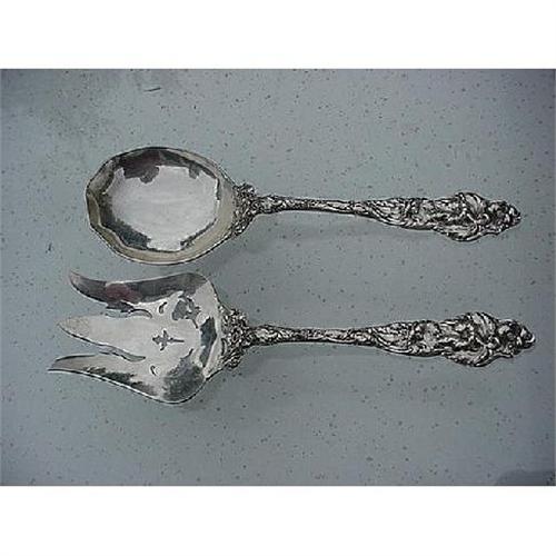 This is a HEAVY and wonderful and OLD Le Six Fleurs Salad Set made by Reed and Barton 1901. It is a heavy pattern , nicely done , and the condition is excellent -We welcome questions about this set as well as our collection of Victorian silver .