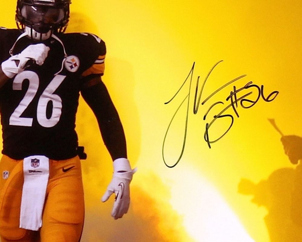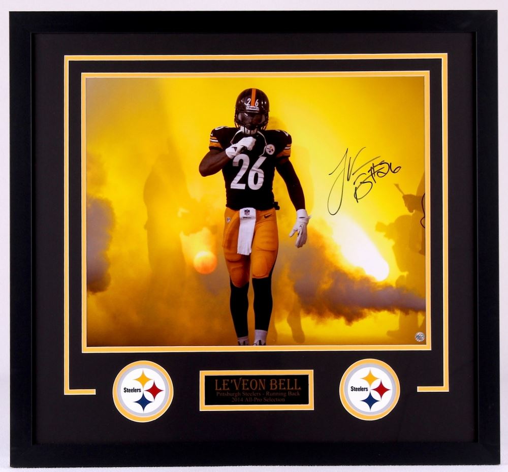 Custom framed photo display measures 26" x 28" in size and has been hand-signed in black felt-tip pen by Le'Veon Bell. The autograph includes an official Total Sports Enterprises (TSE) hologram for authenticity purposes.