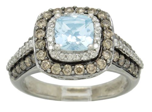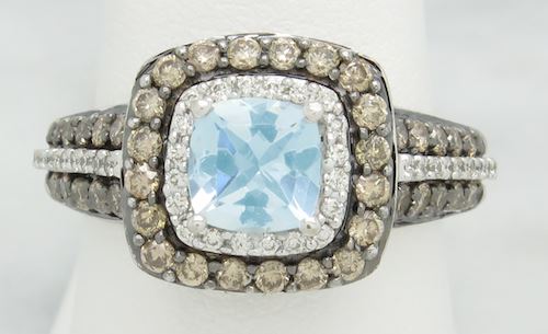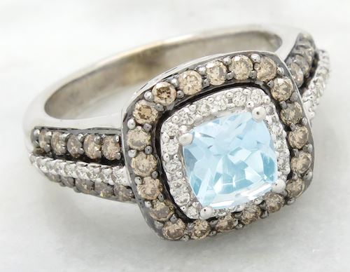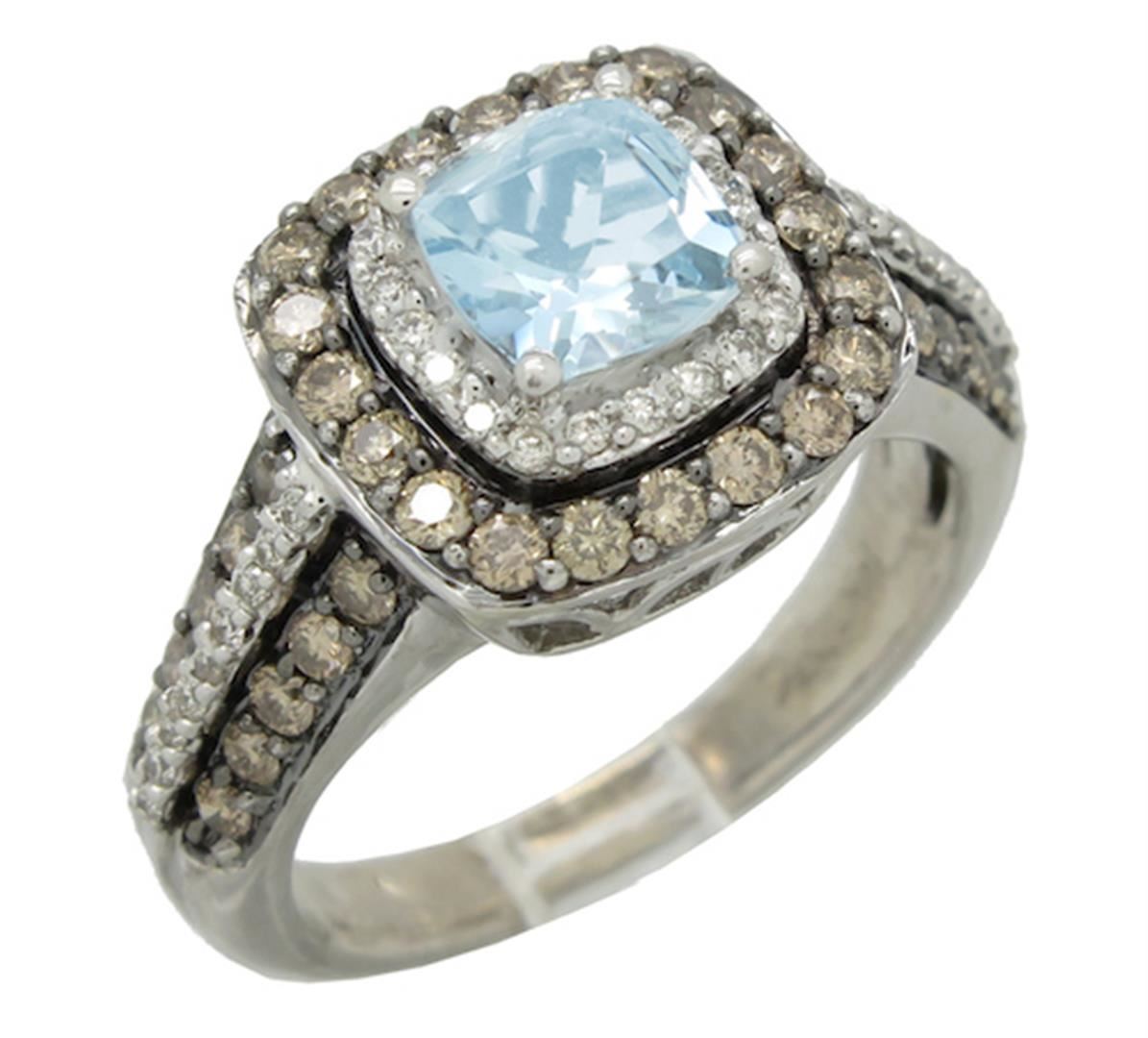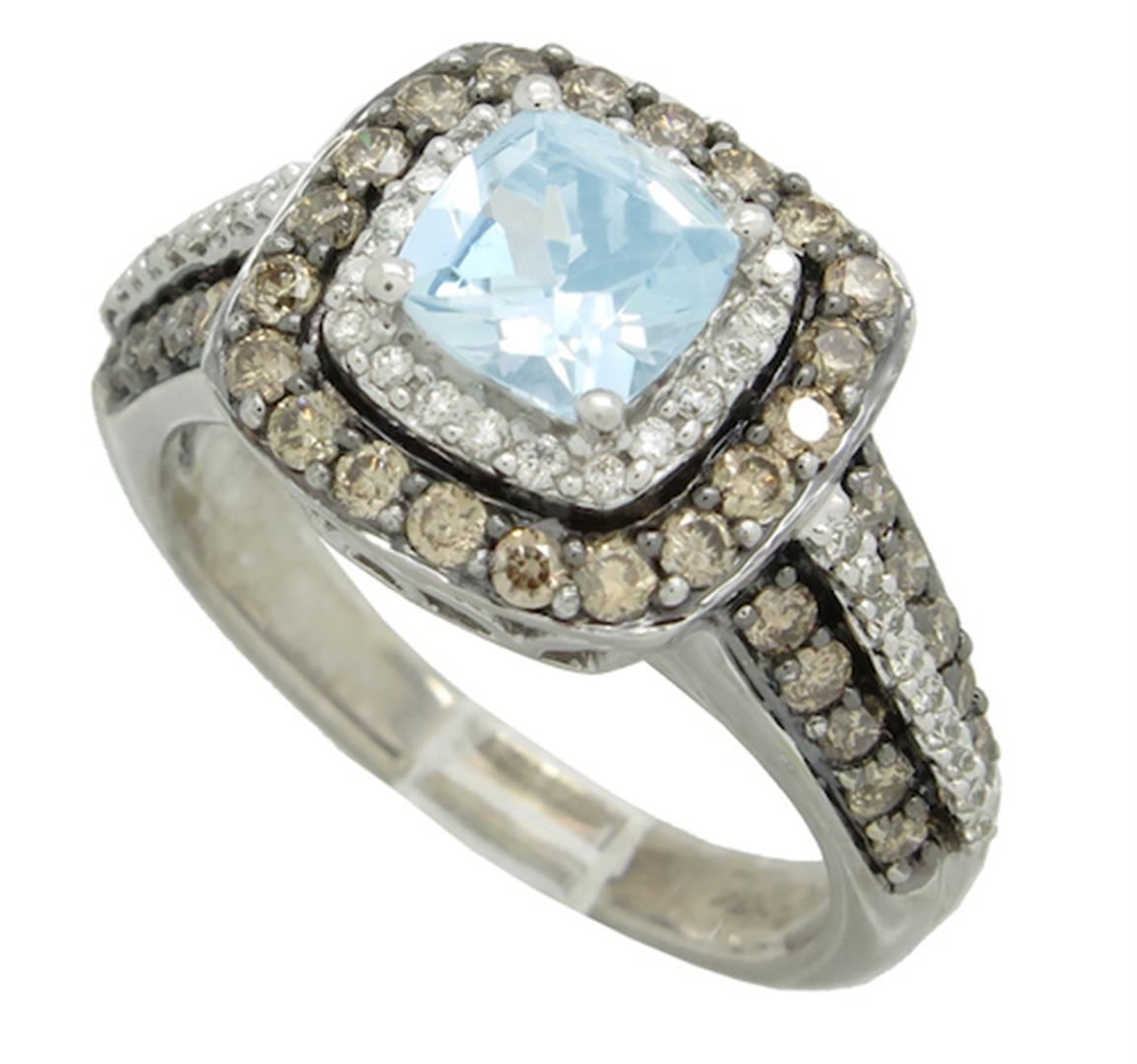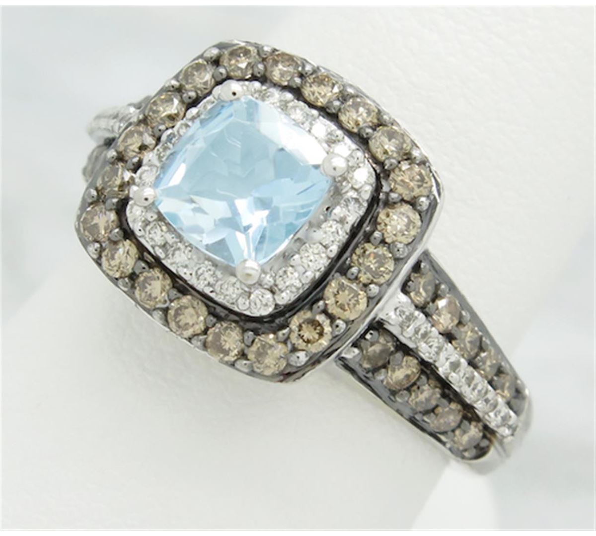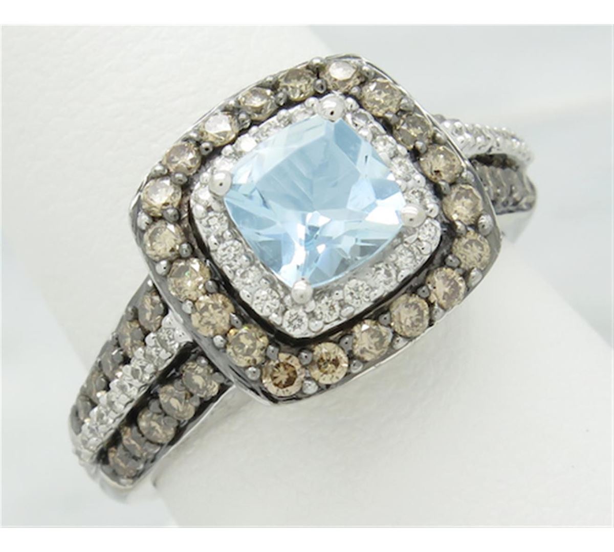 One tested 14K white gold designer Le Vian diamond and aquamarine ring. Containing: One 6MM X 6MM Aquamarine. Approximate Size: 1.00CT. 40 Chocolate and 38 white Round Brilliant Cut Diamonds. Approximate total diamond weight: .73CTW. All diamonds are graded in the mounting unless otherwise stated. Weight of ring: 6.3 grams, Size: 6.5.